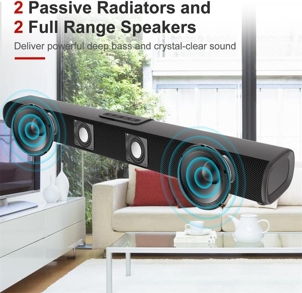Great for 32"or above the TVs, provide powerful bass,clear and precise audio and cinematic surround audio,enhance your TV sound. Control Switch modes via remote or button control; Displays shows current mode.Easy Connections Simply connect to the soundbar via or Audio / RCA/ Optical input.Home Theater Feeling will immerse you in the movie.wirelessly stream music from your device and minimal sounds cut off and distortion.Specification: version: Bluetooth5.0Hands-free call functionInput connection mode: support 3.5mm audio input, , coaxial, , connectionSpeaker output power: 50WDiaphragm: 2Frequency response: 80HZ---16KHZSignal to noise ratio: ≥85dBPlay format: MP3/WAVExternal adapter power supply: 12V-2AShell: ABS plasticDistance: 10mPower supply mode: external power supplyPackage Include: 1* Sound barIf you have any questions about the product, please contact me, we will contact you within 24 hours and give you a satisfactory answer.