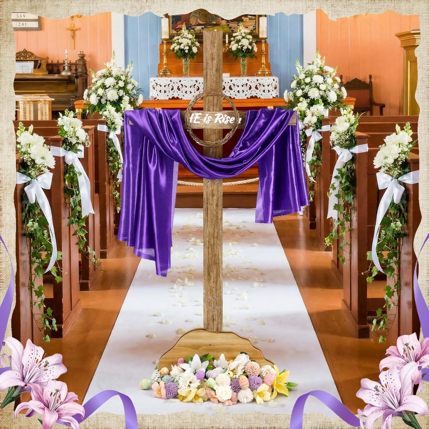 Features: Designed in the [He is Risen] style, this Easter yard cross is a potent religious symbol, signifying rejuvenation, hope, and the divine miracle of resurrection in a visually appealing manner. The standing design of the cross enables an effortless setup. It's user-friendly and doesn't require professional help for installation, allowing you to enhance your outdoor space with Christian symbolism easily. Specifications: Material: main wood Color: wood color and purple Size: Wood cross: about 71 inch Purple ribbon: about 39.3*59Inch, Wreath: about 7.8inch Package includes: 1 x Easter wood crosses 1 x Purple ribbon 1 x Wood wreath Notes: Manual measurement, please allow slight errors on size. The color may exist a slight difference due to different screen displays