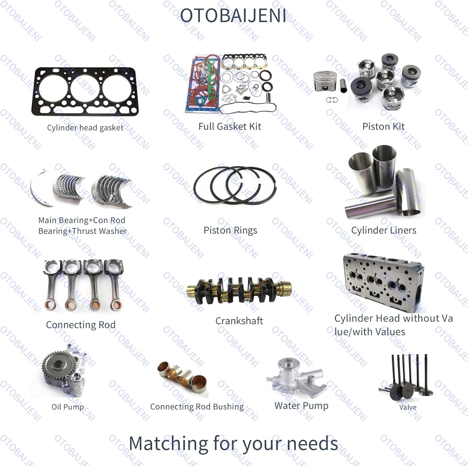 Overhaul Rebuild Kit Compatible for Kubota D1005 Engine Tractor B1750D BB21 B2100 B7500 B7510 B2320 BX2660 BX2670 BX2680 Engine Rebuild Kit Aftermarket Parts▼Product Details:Part Name: Engine Overhaul Rebuild Kit, Overhaul Rebuild Kit, Engine Rebuild KitEngine Model: D1005Material: Metal, RubberFitment Type: Direct ReplacementFeatures: Easy installation, made with high-quality materials, precision-designed, thoroughly inspected.▼Applications:For Kubota Engine D1005For Kubota Tractor B1750D BB21 B2100 B2100DT B2100-HST-D B2100-HST-DB B7500 B7500DT B7500HSD B7510 B7510DT B7510DTN B7510HSD B2301HSD B2301HSD-1 B2320 B2320DT B2320DTN B2320DWO B2320HSD B2601HSD BX2660 BX2660D BX2670 BX2670-1 BX2680For Kubota Mower ZD326 F2560E ZD25FFor Kubota Generator Compactor J312 EW320DSFor JCB Compactor VMT160-80▼Package included:1 set Full Gasket Kit with Head Gasket3 pcs Cylinder Liners3 pcs Piston, STD size3 pcs Piston Pins6 pcs Piston Clips3 set Piston Ring STD size3 pcs Connecting rod bushing1 Set STD Crankshaft / Main Bearing1 Set STD Connecting Con Rod Bearing1 Set STD Thrust Washer / Bearing6 pcs Valve Guides3 pcs Intake Valves3 pcs Exhaust Valves3 pcs Intake Valves Seats3 pcs Exhaust Valves Seats▼Note:1. Please confirm the model and size of the piston currently used in your vehicle.2. Please confirm your vehicle nameplate and engine nameplate.3. We also can supply Piston, Piston Ring, Gasket Kit, Cylinder Head, Connecting rod, Crankshaft, Camshaft, Water pump, Oil pump, Fuel pump, and other parts for Engine rebuilds.