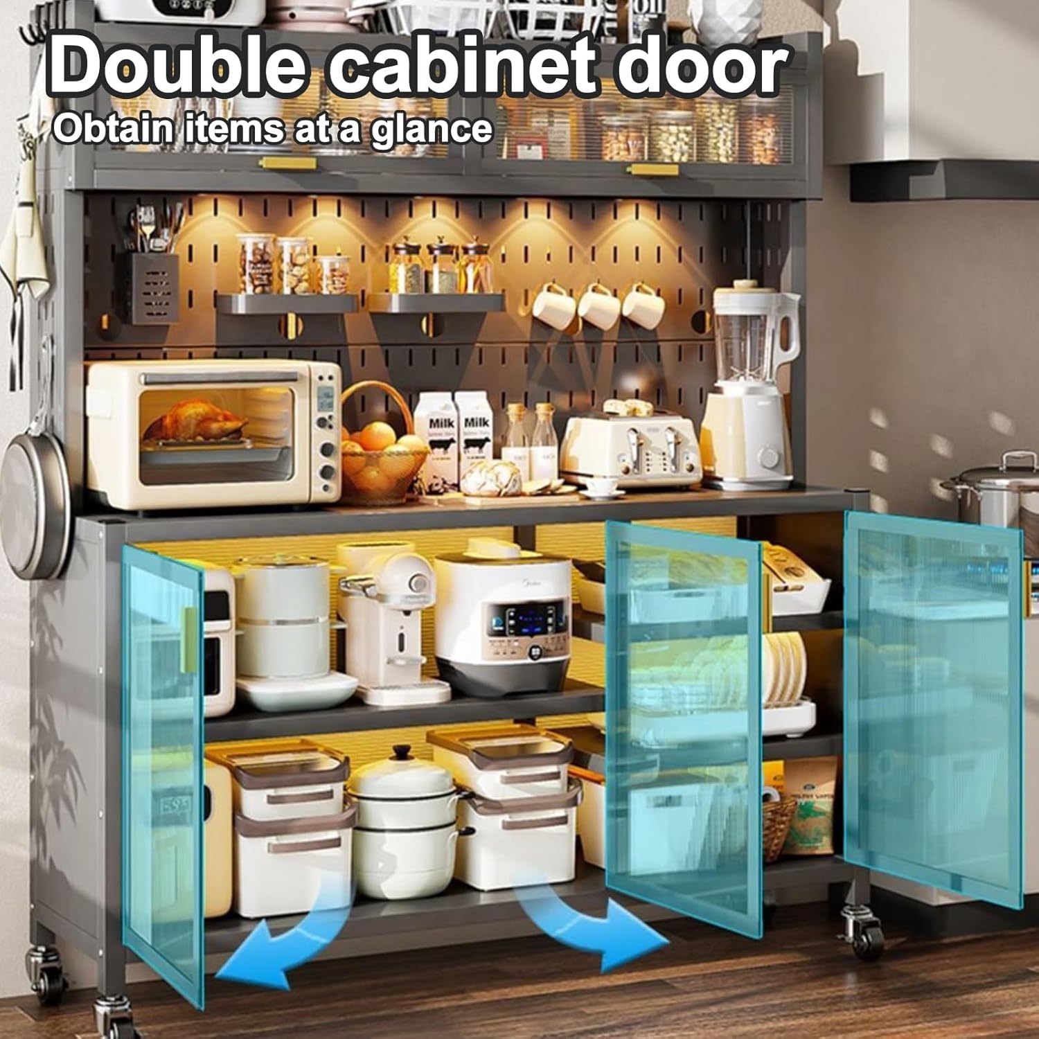 kitchen storage rack: Included Components : Kitchen baker's rack x 1 Knife and fork barrel storage case x 1 Cabinet Sides Hooks x 4 Pegboard Hooks x 4 Practical tray x 2 Product Details: Color: Grey Material: Carbon steel Max Load Capacity: Total 100kg/220 lb Assembly Required: Yes Finish Type: Painted Top layer can put small things that are often used in life Uses For: kitchen, living room, kitchen, dining room, study, hallway Overall Size: 100x42x158cm/39x17x62in 120x42x158cm/47x17x62in 140x42x158cm/55x17x62in Detail: Adjustable floor height Bold and thickened widen depth Stable and not wobbly Screw-free | Tool-free, girls can install it easily ① Expand the main bracket in one second ② All panels snap into slots ③ Click into the cabinet door and hook ◎◎ Tips: 1. The size of the product is measured manually, there may be an error of 0.2-0.4in, and the actual product shall prevail. 2. If you have any product quality problems, please let we know, we will solve the problem for you within 24 hours.