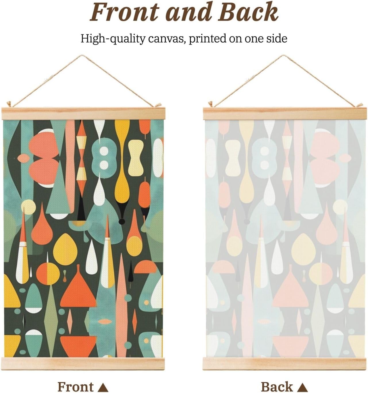 Our Mid Century Modern Retro With Drop Shapes Print Wooden Poster Hanger Is An Excellent Addition To Your Home Decor Or A Perfect Gift For Friends And Family. Made Of Selected Quality Canvas With Brilliant And Enduring Colors, This Wall Art Is Designed To Resist Water, Dust, And Fading, Ensuring The Bright And Vibrant Art Lasts. The Polyester Is Enclosed Between Two Teak Wood Hanger Scrolls With An Attached 35cm Rope For Easy Hanging. Installation Is Made Simple With The Included Two Nails In A Plastic Box. The Modern Minimalist Style Of Our Wall Hanging Complements Any Home Decor, Elevating The Artistic Ambiance And Brightening Up The Room. Experience The Elegant Transformation This Wall Hanging Scroll Painting Brings To Your Spaces Today.