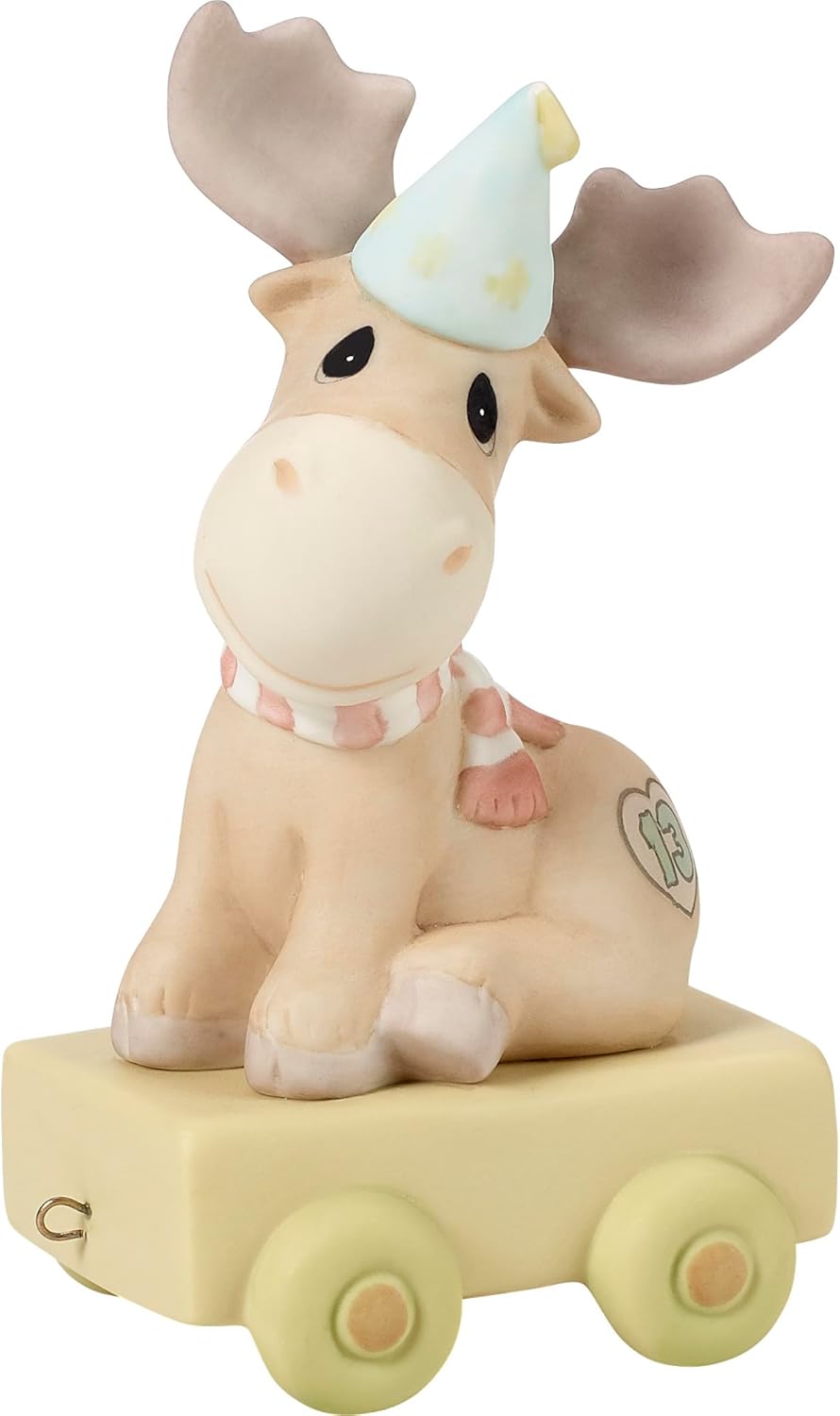 Product Description This updated figurine is part of the Birthday Train series and has a moose with a birthday cone hat on. This is age 13. This series is geared for both boys and girls. From the Manufacturer Show a special 13-year old just how much they mean to you with an antlered friend who is certainly ready to welcome them to their teenage years! Part of the Precious Moments Birthday Train, this piece connects to other figurines in the series to honor birthdays through age 16. Meticulously hand painted and crafted of fine bisque porcelain, it is the perfect birthday gift for any 13-year old – a 13th birthday present that will never be forgotten! Approximately 5 inches high.