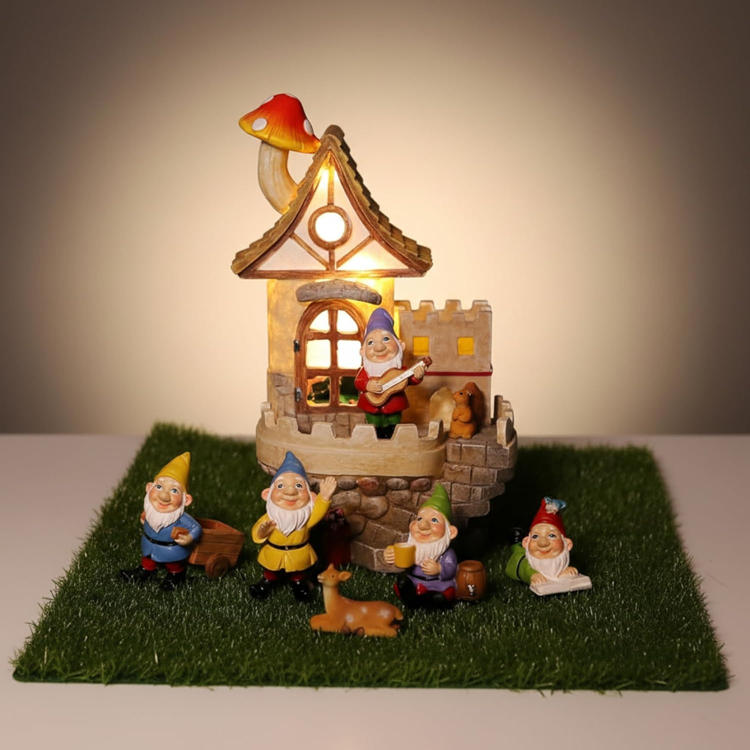Description: Bring a storybook charm to your outdoor sanctuary with this Solar Fairy Garden House. During the day, the meticulously hand-painted resin castle and its playful gnome inhabitants create a cheerful, fairy-tale scene. As evening falls, the integrated solar panel charges throughout the day to power soft, ambient LED lights within the castle, transforming your garden into a luminous wonderland.Designed for lasting enjoyment, this outdoor decoration is built from resin to endure various weather conditions. The high-quality materials and UV-resistant paint ensure the vibrant colors and intricate details resist fading from sunlight and damage from . It's a low-maintenance way to add year-round elegance.Perfect for creating a focal point in your fairy garden kit or adding a to a patio table, this set invites imagination. It makes a thoughtful and unique present for anyone who cherishes their garden or enjoys decorative storytelling with fairy garden figurines. Watch as this enchanting castle becomes a beloved part of your home's outdoor character. Features:. -Material: Resin. -Size: Castle 21x12.5x10 cm/8.3x4.9x3.9 inch. Note:Manual measurement, please allow slight errors on size.The colors may exist slight difference due to different screens. Package Including 1 * Fairy Garden House7 * Small Gnomes