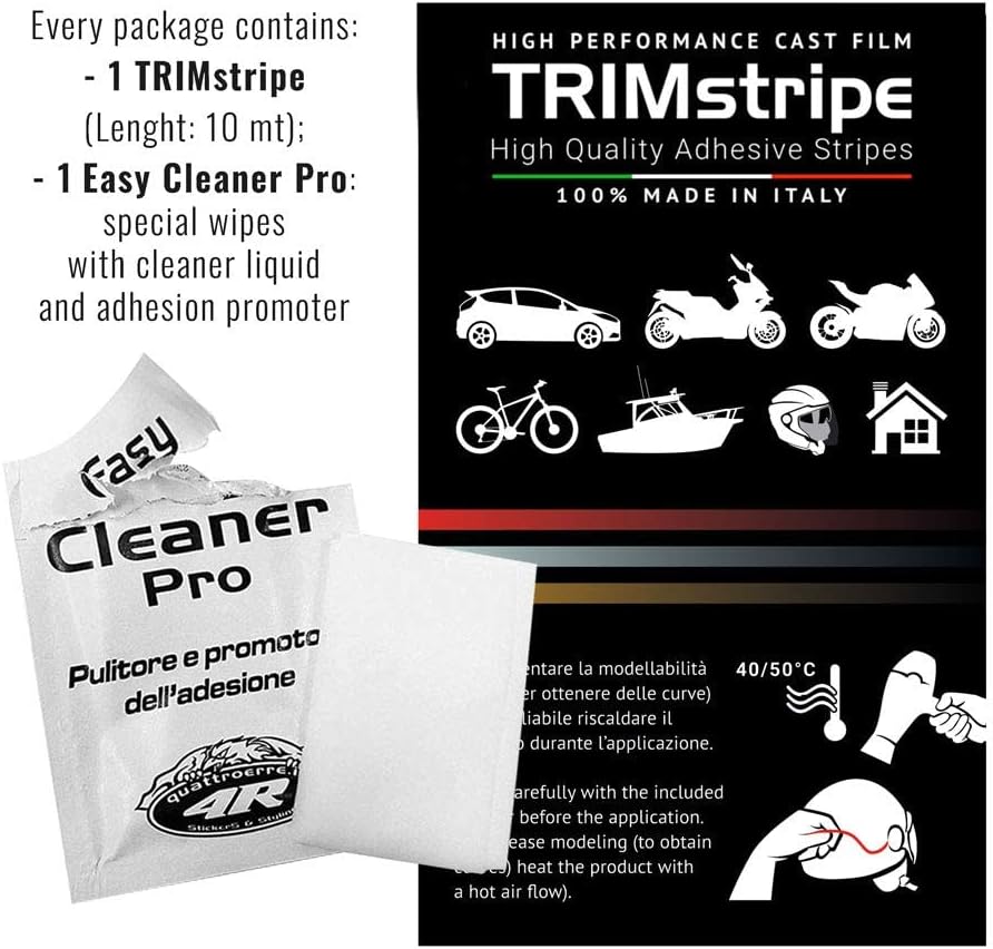 Decorative or functional adhesive strips for cars, motorcycles, bicycles, boating and do it yourself. CAST vinyl with excellent modeling and resistance to atmospheric agents. Thermoformable: molding can be increased by heating the product. Each pack contains a cleansing wipe and adhesion promoter. Strip size: 100 mm x 10 meters.