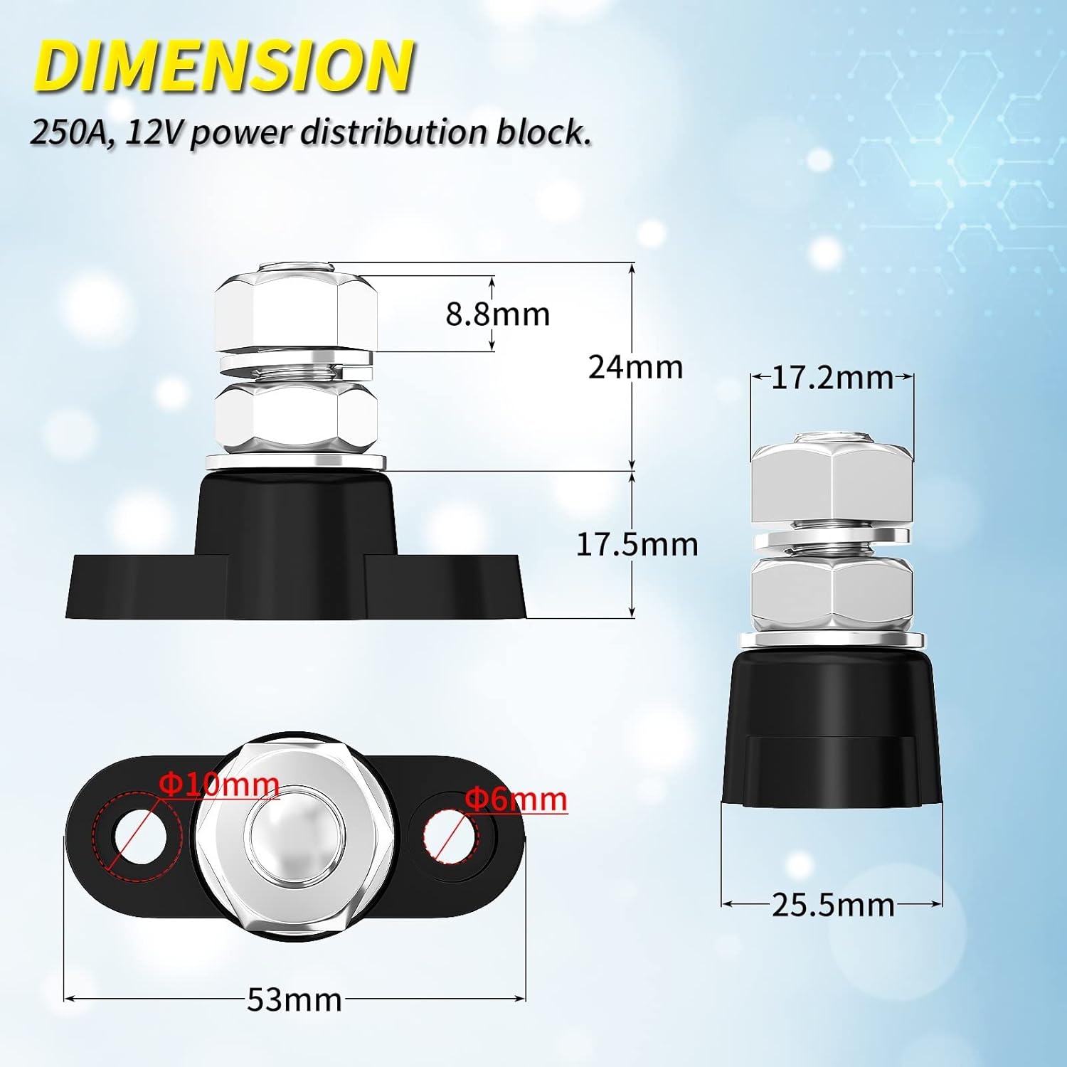 Rectangular ConnectorsAutomotive Power Distribution Block Single 3/8 M10 Stud Terminal Battery Junction Post Bus Bar 250A 12V Max 48V DC 1PcsAbout this itemProduct - A pair of single stud terminal 12v power distribution block, includes a positive power distribution block and a negative power distribution block.Rating - The battery distribution block rated 250A when work in 12v supplier circuit, and the 12v distribution block can work with MAX 48v power supplier.3/8" Stud Terminal - The battery post is single 3/8" stud terminal design, which makes the 12v bus bar terminal block be able to accept large size terminal connectors and wires.316 Stainless Steel Terminal - The terminal of the terminal post is made of 316 stainless steel, which makes this 12v junction block have better corrosion risistance performance compared with 304 stainless steel made battery bus bar.Automotive Power Distribution Block:What is included:1 x Positive Power Distribution Block1 x Ground Power Distribution Block4 x Mounting ScrewsVoltageMax 48V DCTerminalsSingle 3/8" (M10) Stud TerminalMax Continuous Current250 AMP @ 12VMaterials316 Stainless Steel Terminal & Superior Nylon BaseColorPositive Bus Bar Red Negative Bus Bar BlackFeaturesSimple Construction & Easy to Use38" Stud TerminalThe 12v distribution block is single M10 (3/8") stud design, which makes the battery bus bar 12v become suitable for larger size terminal connectors and wires.316 Stainless Steel StudThe terminal of the 12v junction block is made of 316 stainless steel, makes the terminal post safer and more reliable due to its superior corrosion risistance performance.ApplicationThe marine bus bar terminal block aims to make your wiring neat and tidy,