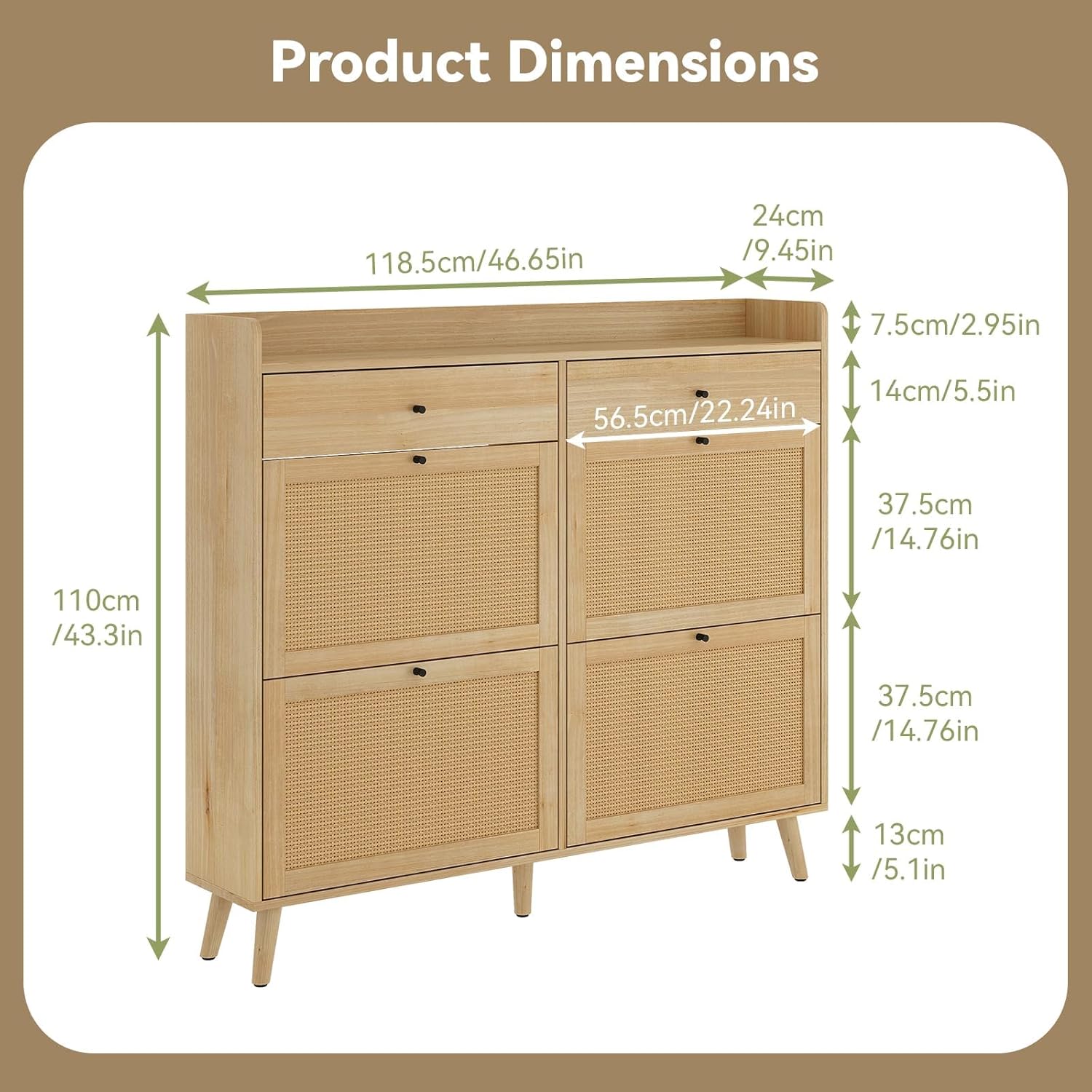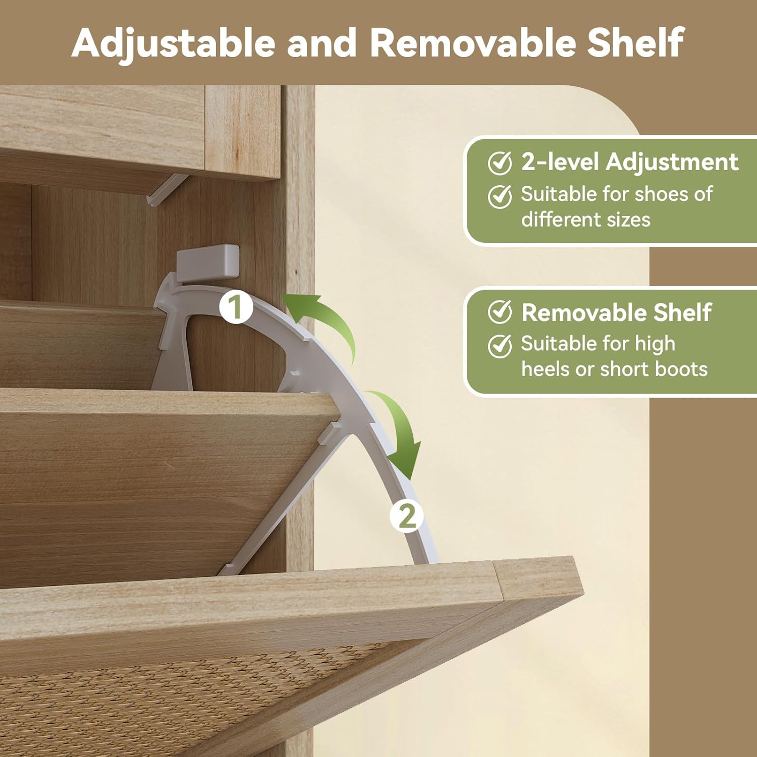 [LARGE CAPACITY FOR EFFICIENT STORAGE]Our shoe cabinet features four spacious flip drawers, designed to hold 20 to 24 pairs of shoes, accommodating various sizes and styles. The internal shelves are adjustable, allowing you to customize the space to fit flats, mid-boots, or heels effortlessly. The thoughtful backless design promotes ventilation, ensuring your shoes remain dry and fresh. Plus, the open space at the bottom is not only easy to clean but also provides extra room for storing slippers, contributing to a neat and organized home.