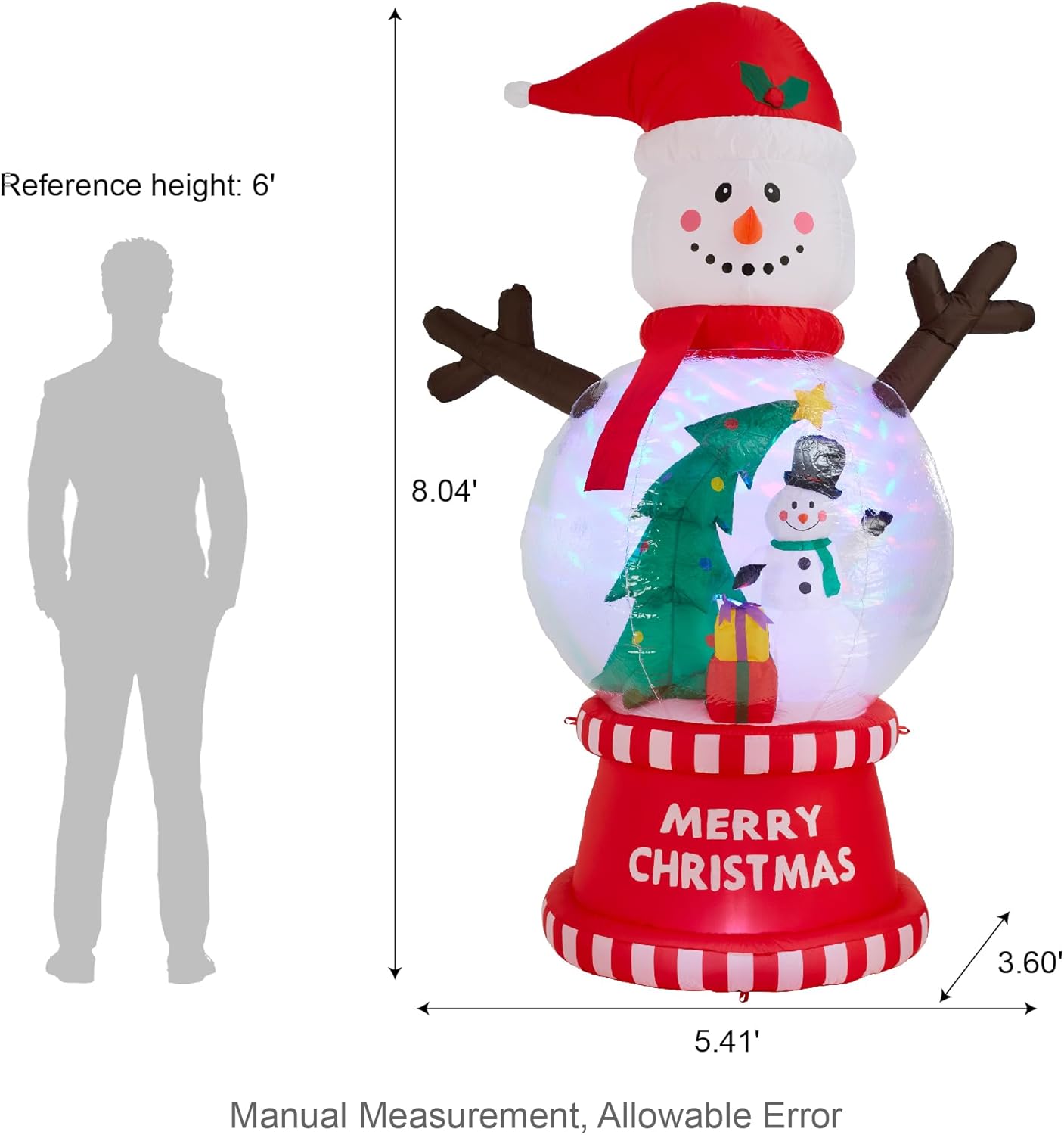 Specifications:Material:100%PolyesterOverall Dimension: 65"L x 43.25"W x 96.5"HWeight: 4.4 lbsColor info: As PictureTheme: Christmas Decor Occasions: Outdoor & IndoorNo Assembly RequiredFeatures: 1.Bring magical holiday charm to your home with the Glitzhome 8FT Inflatable Snowman Globe. This enchanting decoration features a jolly snowman with red hat and scarf, enclosed in a transparent globe body that reveals a delightful Christmas scene complete with snowman, Christmas tree, and festive gifts. The built-in LED lights illuminate the entire display, while the base proudly proclaims "MERRY CHRISTMAS" in bold letters.2.Whether enhancing your outdoor holiday display or adding cheer to indoor festivities, this snowman globe creates a captivating focal point. The extended power cord offers flexible placement in gardens, lawns, entryways, or as a stunning indoor centerpiece. Its low-noise operation ensures the peace of the season remains undisturbed.Packge includes: 8FT Lighted Christmas inflatable Snowman Globe Scene Decor * 1